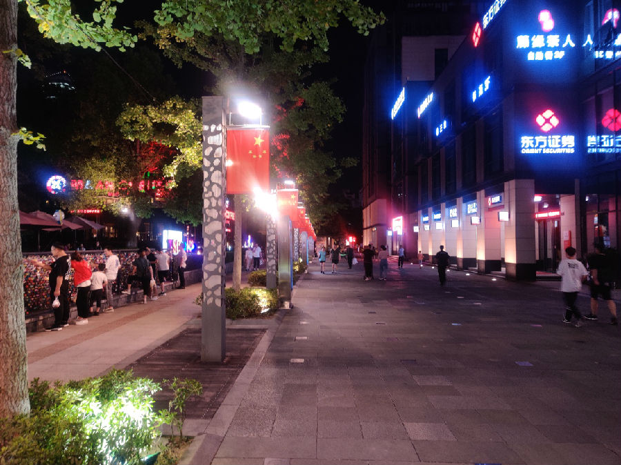 这张图是在国庆第一天1200拍摄的,举国同庆,而在这天也有很多商家经营到很晚,所以即使到了12点依然灯火通明,而因国庆也有很多人出来散步,有的停下来一个人低头处理工作,有一家人出来的,也有一些青少年玩滑轮,所以想突出在国庆,城市中的瞬息万变,而抓拍滑轮滑过的这个镜头呢,则是想让这个动景与后面的静景突出对比,路中央有红旗,而我选择冷色调的光源与其形成一种色彩对比,也是想表达出一种城市魅力。