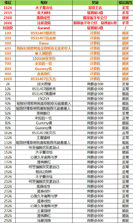 特别说明:由于本次抢楼活动规则特殊限定“每个用户连续留言不得超过2条,且每人仅可获取1次实物奖励机会,而网薪奖励最多可获得3次!”不符合规则的留言或超过获得奖励次数均做顺延处理,即楼层奖励顺延至下一个符合条件的用户,望大家了解~!