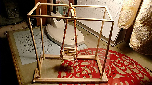 秋千本是童年的玩物,它是我们就能回忆起美好的童年,至于用一次性筷子做,也是秉乘着低碳环保的理念,把竹、木用在值得的地方。