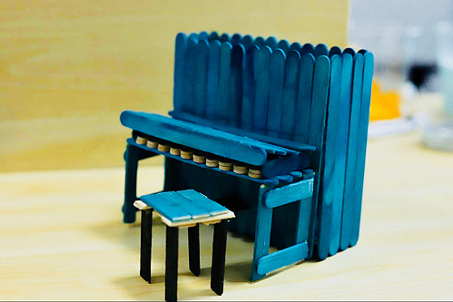 钢琴笔筒用雪糕棍制成,通过对雪糕棍的剪切、固定、装饰,实现了对废旧物品的重复利用,体现了环保的观念。笔筒用固定杆固定坚固耐用;造型精美,富有创意。