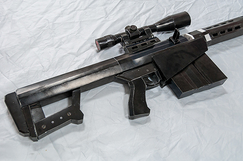 采用硬板纸和黑色喷漆,打印出1:1仿真的巴雷特枪,巴雷特是美国巴雷特火器制造公司,射程远,精度高,威力大的狙击步枪,在国际军火界拥有“重狙击之王”的赞誉,也被俗称为“大炮”,在中国军队是一把见血封喉的利剑,它分解成上机匣、下机匣及枪机框3部分。分解销位于机匣右侧,一个在弹匣前方,另一个在枪托底板附近上下机匣是主要部分,为了保证其强度及耐磨性选用了高碳钢材料。下机匣联接两脚架、枪手底板及握把,其内部包括枪机部件及主要的弹簧装置。上机匣主要包括枪管部分,即枪管、枪管复进簧和缓冲器焊接在上机匣上面的是机械瞄具、光学瞄准镜座及提把,而与内部焊接在一起的是枪管衬套及枪管止动销。随后进行裁剪粘贴,用卡纸做到巴雷特仿真枪的效果,全程耗费用时150小时以上。